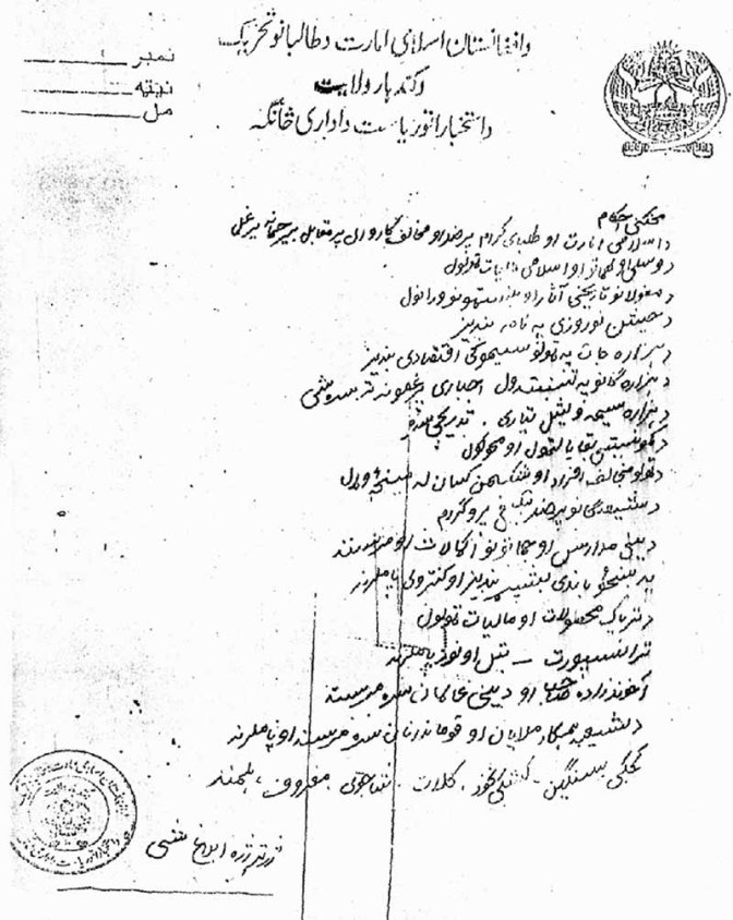 Mullah Omar’s Farman to Taliban – A copy of this document (written in Pushto) was secured from Taliban’s Dept of Interior Ministry after US bombing in late 2001. The document is an order/policy by Mullah Omar to the Taliban commanders.