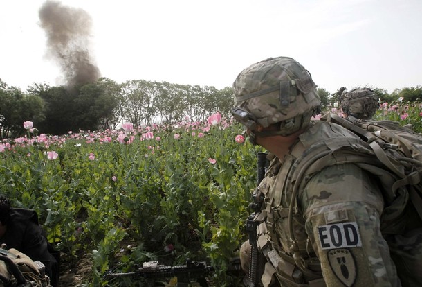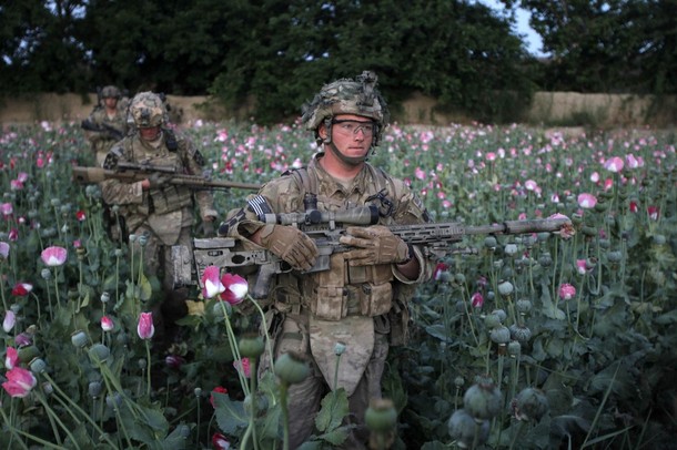 حدود یکصد و پنجاه هزار سرباز بین المللی در افغانستان می باشند که بیشتر آنان در جنوب مستقر هستند. کشورهای غربی مدعی اند که مبالغ هنگفت پول برای مبارزه با مواد مخدر به مصرف می رسانند اما نظامیان آنان بدون کدام مبارزه ای با تولید کنندگان و قاچاقچیان مواد مخدر، در بزرگترین کشتزارهای مرگ جهان در جنوب و شرق افغانستان قدم می زنند.