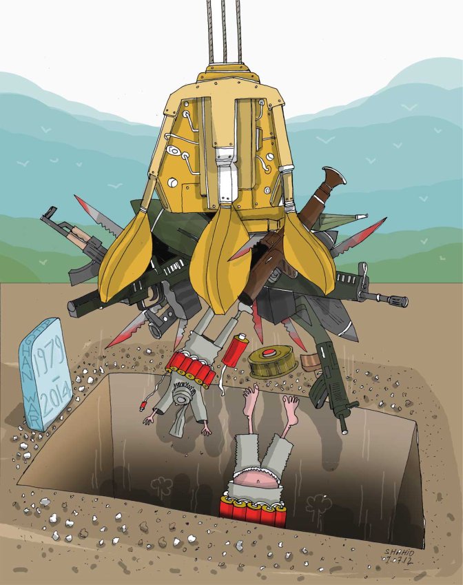 جان خداوند شما را در حفظ خود داشته باشد که واقعیت های عینی جامعه درد دیده افغانستان را به هنر ارزشمند خود ترسیم مینمایید خدا کند تا ۲۰۱۴ را این کله خران حزب ضد مسلمانی گلبدین جنگیار طالبان فرب خوره خونخوار اله دست دالخور های چتلستانی اعضای سابق عاشقان قدرت جمعیت های جنگ طلب وهمه گروهای وحشت ودهشت جنگ طلب سر عقل امده جنگ خنمانسوز را بس نموده اتش بس عمومی نموده برود به طرف مبارزه وفعالیت انسانی انتخاباتی واز طرق مشروع قانونی به قدرت رسیده وحقوق تمام مردم رجدیده عذاب کشیده افغانستان را مراعات نموده دیگر بدست بیگا نه ها زمینه و بهانه مداخله را ندهد ورنه اخر اه مردم این هارا به قعر عذاب ماتم ودوزخ خواهد برد انشاه الله تعالی .مانند ربانی نجیب و
