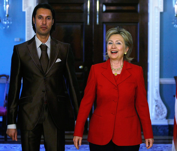Note: The top photo depicts Secretary of State Clinton in one of her meetings with Uzbek dictator Islam Karimov. She was last in Uzbekistan in December, 2011. Just as the Arab Spring was beginning in the Middle East, an Uzbek Spring was quietly being suppressed with Obama Administration support. The photo below shows Secretary Clinton greeting brutal Libyan secret police chief Mutassim Qaddafi at the State Department on April 21, 2009.