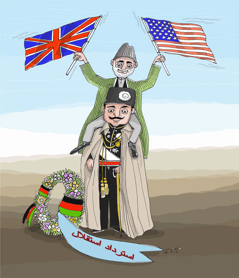 بجا و زیبا کشیده ای کرزی خودش در مصاحبه اش از تلوزیون امریکا اعتراف کرد که جاسوس است. وهم سفیر امریکا در تاجکستان خاطره اش را از زمان وظیفه اش در پاکستان به تحریر آورده که مصادف میشود به سالهای جوانی کرزی در پاکستان وجهادیگری برای رضای ضیاالحق . طبق این نوشته در آنروز کرزی لباس سفید و پاک اش را پوشیده سرو صورتش را آراسته به آستان بوسی سفیر رفته وداوطلب حلقه غلامی می شود.چون ترک عادت نه می تواند اکنون حتی از دست سفیر وجاسوس ایران پول میگیرد.ازینکه دهانش پرآب است دربرابر دزدی وخیانت زاخیلوال وزیر مالیه اش سر بی ننگ خود را زیر برف نگه میدارد. این کارتون به او خوب می خواند.