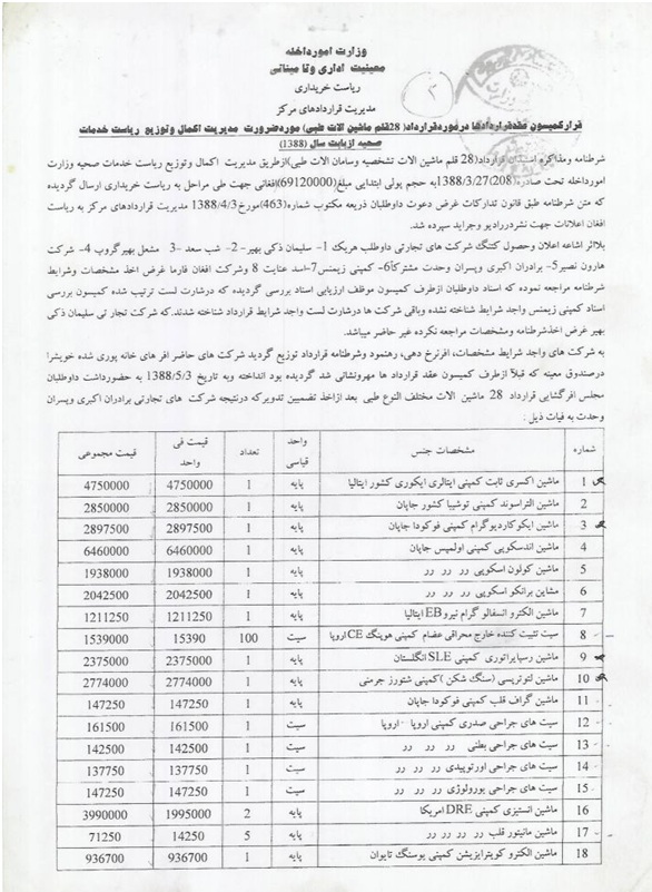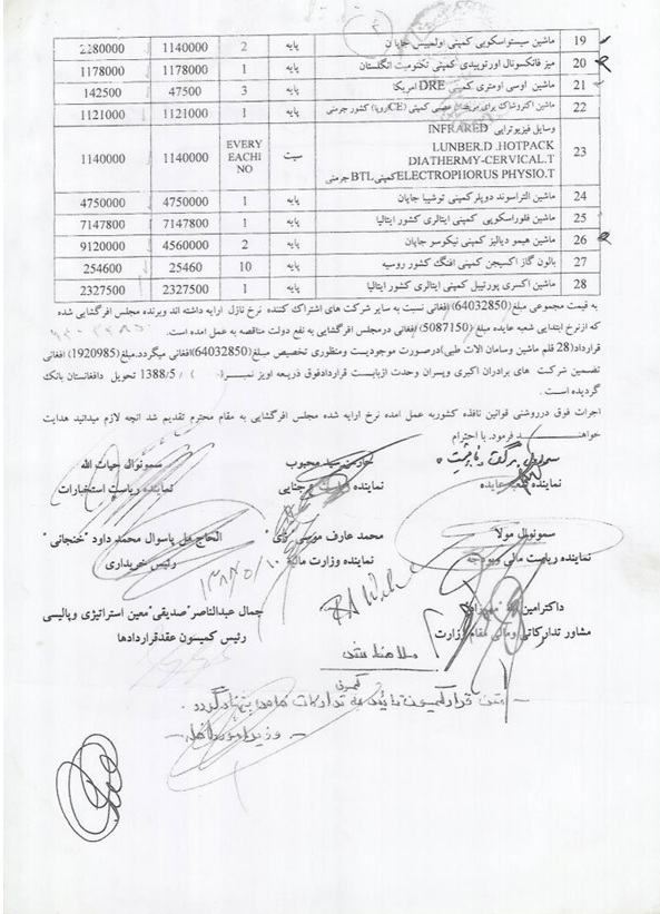 اسنادی که در ذیل به مشاهده میرسد دربارۀ حیف و میل و اختلاس ملیون ها دالر توسط داکتر قندهار شینواری رئیس شفاخانه دوصد بستر پولیس ملی از بابت خریداری ۲۸ قلم ماشین الات و تجهیزات طبی برای ریاست صحیه دوصد بستر پولیس میباشد که در آن به وضوح دیده میشود که نرخ و قیمت خریداری هر قلم ماشین و سامان آلات طبی مندرج در جدول خریداری چندین بار بیشتر از نرخ، ارزش و قیمت اصلی و حقیقی ماشین در مارکیت و بازار جهانی میباشد. پی بردن به ارزش، قیمت و نرخ حقیقی و اصلی سامان آلات، تجهیزات و لوازم خریداری شده طبی به دلیل اختصاصی بودن ماشین ها و سامان آلات طبی برای هموطنان عادی ما شاید یک مقدار دشوار باشد، ولی خوشبختانه برای دکتوران و کارمندان محترم وزارت صحت عامه کشورما و به خصوص دکتوران و پرسونل طبی شفاخانه های چهارصد بستر اردو و دوصد بستر پولیس ملی بسیار سهل و آسان بوده و به چندین بار گران بودن قیمت خریداری شده ی هر قلم ماشین طبی نسبت به قیمت اصلی و حقیقی آن در مارکیت جهانی مهر تایید میگذارند. به خصوص در حال حاضر در افغانستان که از برکت پیشرفت علم و تکنالوژی عصری- کامپیوتر و انترنیت - دسترسی به هرگونه اطلاعات در ظرف چند لحظه سهل و آسان بوده و هموطنان ما میتوانند صحت و ثقم مسئله را از طریق انترنیت با مراجعه به شرکت های تجارتی معتبر و شناخته شده بین المللی که هرگونه خدمات تجارتی را، به خصوص در بخش سامان آلات و لوازم طبی، به مشتریان، شرکت ها و نهاد های رسمی و خصوصی اراییه میدارند، ثابت بسازند.