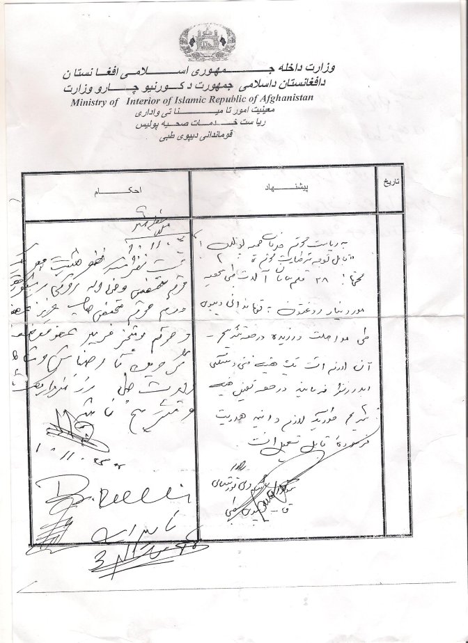 • من نیز تعجب میکنم که امضای داکتر قندهار شینواری رئیس شفاخانه در زیر این سند نیست. در حالیکه او بحیث رئیس باید امضا میکرد. اما جالب است که نویسنده فقط همین رئیس را مسوول میداند و با این شش نفر دیگر ( به شمول وزیر داخله) که این سند را امضا کرده اند هیچ اعتراضی ندارد.