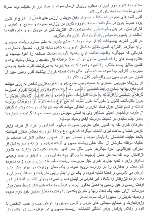 کابل پرس: آنچه را که در ادامه می آيد متن نامه ی برخی از مقامات تجاری افغانستان به حامد کرزی می باشد که پرده از فساد گسترده ی مافیای طالبان نکتایی پوش در وزارت تجارت افغانستان به رهبری انورالحق احدی بر می دارد. از انورالحق احدی تاکنون اسناد زیادی درباره ی اختلاس و چپاول میلیون ها دالر در کابل پرس و رسانه های دیگر به نشر رسیده است. با وجود همه ی این اختلاس های گسترده که او در وزارتخانه های مالیه و تجارت انجام داده، اما همچنان به عنوان یکی از مهره های اصلی مافیا در افغانستان بر قدرت تکیه زده است.