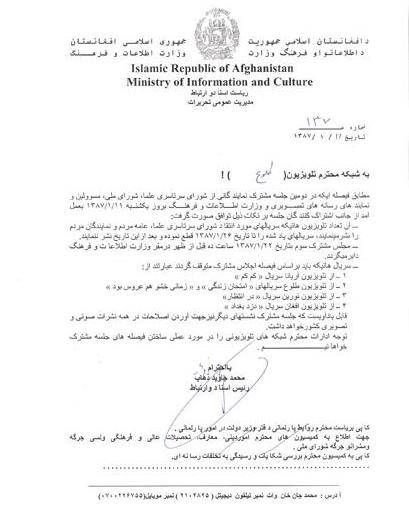 نامه ی وزارت فرهنگ به تلويزيون طلوع