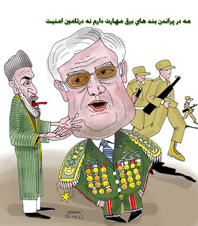 تعداد مدالهای وزیر صاحب از اصل کرده کمتر رسم شده است و این یک اهانت است.ضمنآ من نفهمیدم که کرزی بعد از این حادثه چند تا نان خیرات کرد یانه؟اینا یک صدقه هم برای غریبا هم نمیدهند.باز کرزی صاحب خوشحال باشد که اگه ده اول از مرمی نمرد،پسان در وقت فرار اگر وزیر صاحب عقب نشینی بالایش چپه میشد خو باز توته هایش ره کسی خو جمع هم کرده نمیتانست.باور کنید ای وزیر صاحب ایقه بی خیر و بی کفایت است که اگه به عوض قلبه گاو در قلبه بسته یش کنی خو ده همو زمین گندم چه که علف هم سبز نمیشه.بیادرا راستی یادم رفت که بگویم که اگه شما وزیر صاحبه در قلبه بسته کدید طرف دیگه خرم صاحب ره بسته کنید.هم وزن شان است.
