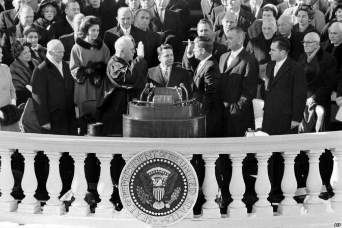 جان اف. کنېډي د قاضي القضات "ارال وارن" پر وړاندې د امریکا د پنځه درېشم جمهور رییس په توګه لوړه وکړه. ۲۰ جنوري ۱۹۶۱ واشنګټن.