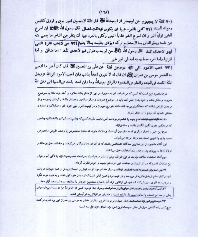رسول خدا فرمود کسی که خانواده مرا دوست نمی داردبرای یکی از این سه امر است. 1- یا منافق است 2- یا زنازاده است. 3- یا مادرش درناپاکی به او ابستن شده. منبع: کتاب خصال شیخ صدوق، جلد اول، ص128،حدیث 72/ این کتاب تحت نظر و به قلم ایت اله کمره ای نوشته شده. چاپ شده در قم به سال 1374