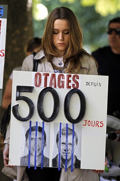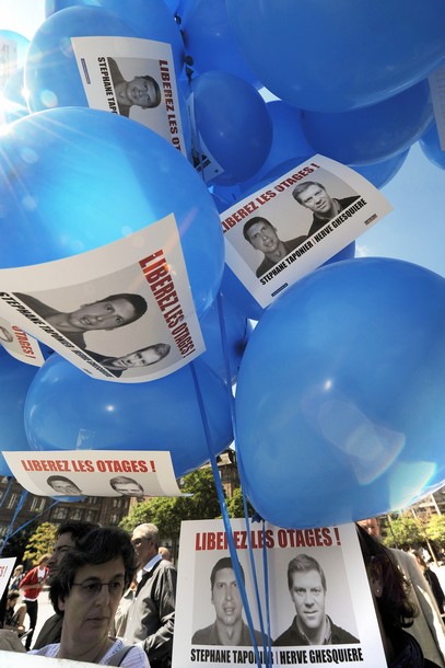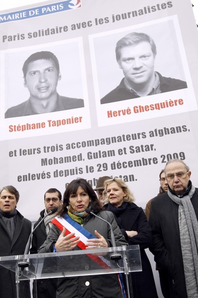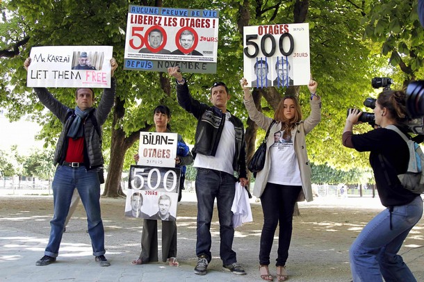 کابل پرس?: روز جمعه 13 ماه می 2011، تعداد زیادی از خبرنگاران در پاریس گرد هم آمدند و باز هم خواستار آزادی دو خبرنگار فرانسوی از چنگال تروریستان طالب شدند. آنان 500 بالن را به نشانه ی 500 روز اسارت این دو خبرنگار در چنگال طالبان، در آسمان پاریس آزاد کردند.