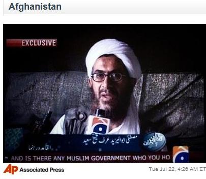 در اين عکس که از يک ويديو گرفته شده، يکی از سران مهم القاعده "مصطفی ابو اليزيد" در ولايت خوست، از پاکستانی ها می خواهد برای جنگ به افغانستان بيايند. اين ويديو بتازگی توسط تلويزيون "جی او" ی پاکستان پخش شد. مصاحبه با مصطفی ابو اليزيد در همين ماه جولای 2008 صورت گرفته و کاملا تازه است.