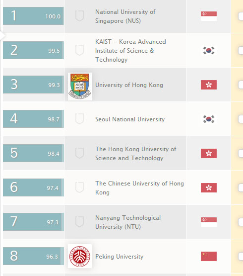 از سوی دیگر طبق رتبه بندی این موسسه، افغانستان هیچ دانشگاه برتری در آسیا نیز ندارد. در آسیا دانشگاه ملی سنگاپور، انستیتوت پیشرفته علم و تکنالوژی کوریا، دانشگاه هنگ کنگ، دانشگاه ملی سئول، دانشگاه علم و تکنالوژی هنگ کنگ، دانشگاه چینی هنگ کنگ، دانشگاه تکنالوژی نانیانگ، دانشگاه پکن، دانشگاه علم و تکنالوژی پوهانگ و دانشگاه توکیو به ترتیب رتبه های نخست تا دهم را در آسیا به خود اختصاص داده اند.