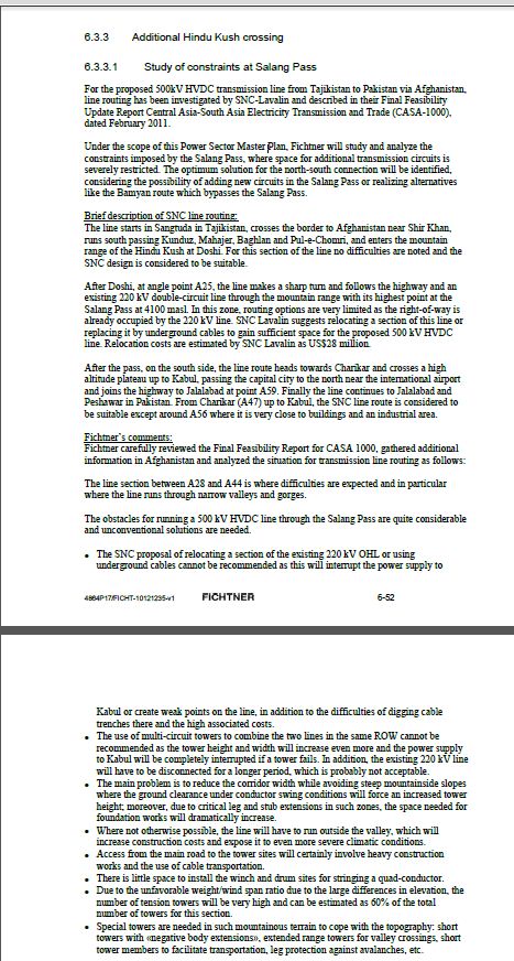 فیشنر در این گزارش ۴۵۱ صفحه‌ای همواره بر عبور خط انتقال برق از مسیر بامیان-سمنگان تأکید کرده است.