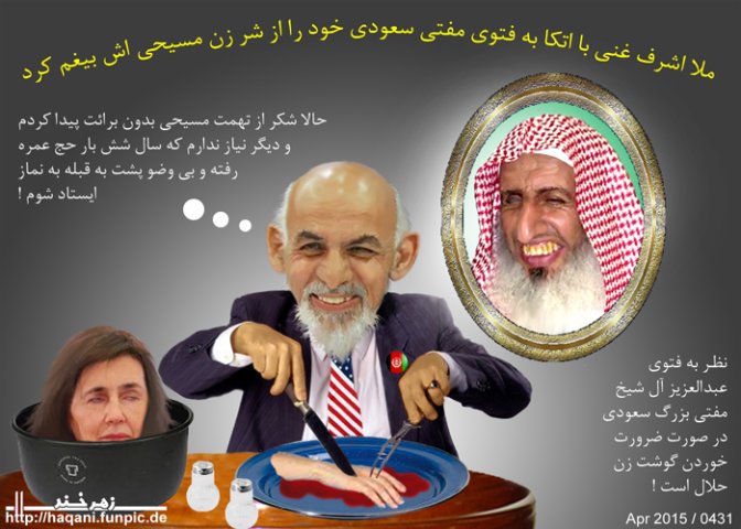 ملا اشرف غنی که در ایام جوانی در خواب های شیرین چله زمستان هم تخت و تاج کابل برایش میسر نمیگشت در آن ایام تن به دوستی و محبت زن ترسایی داد که امروز برایش درد سری بزرگی خلق کرده و حریفان همیش بر او برجسپ یهود و نصارا را می زنند که بیچاره برای رد این اتهامات تا حال شش بار به حج عمره رفته و چون دزد نابلد درکادان بی وضو پشت به قبله ایستاده ، وعده اسلامی کردن اردوی ملی را داده و در ارگ ریاست جمهوری دری ورودی مخصوصی برای ملایان و مولویان درست کرده ، در هر مناسبتی از پیامبر اسلام صلی سلم روایت ها کرده ولی افسوس که همه این سعی و تلاش ها بجایی نرسیده و تاپه یهود و نصارا هنوز هم بر پیشانی اش باقی مانده.