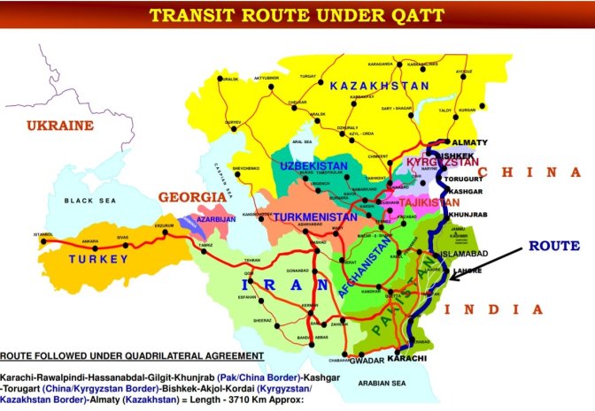 2- یک سازشنامه دیگر بازرگانی - ترانزیتی چهار جانبه زیر عنوان "سازشنامه چهار جانبه حمل و نقل ترانزیتی (The Quadrilateral Traffic in Transit Agreement-QTTA) " میان پاکستان، چین، قرغیزستان و قزاقستان به تاریخ ۹ مارچ ۱۹۹۵م به امضا رسیده بود که حدود یک و نیم دهه پیش تر از "اپتا-APTTA" نهایی گردیده بود. این مسیر با دور زدن افغانستان و از طریق بزرگ راه قراقرم که پاکستان (گلگت بلدستان) را با چین (سینکیانگ) وصل می کند، پیوند دهنده این چهار کشور می باشد. گرچه این نزدیک ترین مسیر نیست اما راه مطمین تجاری-ترازیتی پاکستان به چین و آسیایی میانه و مناطق دور تر از آن است. این مسیر هم در فصل زمستان مشکلات معین خود را دارد که کمتر از مشکلات کوه های سالنگ در مسیر میان کابل و مزار شریف نیست . این جاده از سال ها بدین سو فعال است و جز پروژه "سی پیک- CPEC " می باشد. در سال ۲۰۱۷م تاجیکستان هم تمایل خود را به پیوستن در این پروژه اعلام کرد و در ۸ می ۲۰۲۰م معاون نخست وزیر اوزبیکستان، "سردار امرزاقف" نیز از درخواست رسمی آن کشور به عضویت این توافقنامه خبر داد . این دهلیز قرغیزستان، تاجیکستان، قزاقستان، و اوزبیکستان را قادر می سازد تا در بازار های چین و پاکستان و نیز همزمان به بندرهای دریایی پاکستان هم دسترسی پیدا می کنند. نگاه شود به :نقشه زیر.