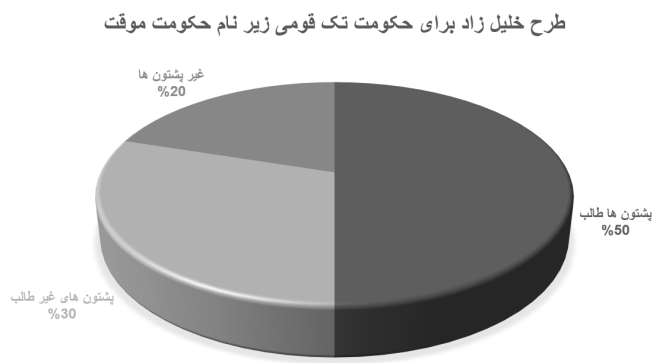 منابع کابل پرس می گویند که در طرح زلمی خلیل زاد در قالب حکومت موقت، تا پنجاه درصد از قدرت به طالبان واگذار خواهد شد و بیست تا سی درصد قدرت نیز به پشتون هایی که حداقل به ظاهر با این گروه نیستند و زیر شعار ملی گرایی و مشارکت همه ی اقوام، طرح اصلی پشتونیزم را پیش می برند.