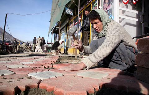 يو کارگر په کابل کښی د پياده رو تزئينی تيګی فرش کوی