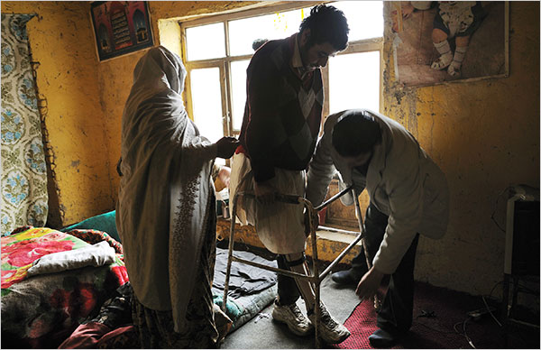 مسعود 20 ساله پاهای مصنوعی را همرای مادر و یک داکتر در کابل امتحان می کنند. مسعود که، این افسر پولیس در یک حمله طالبان زخمی شد.