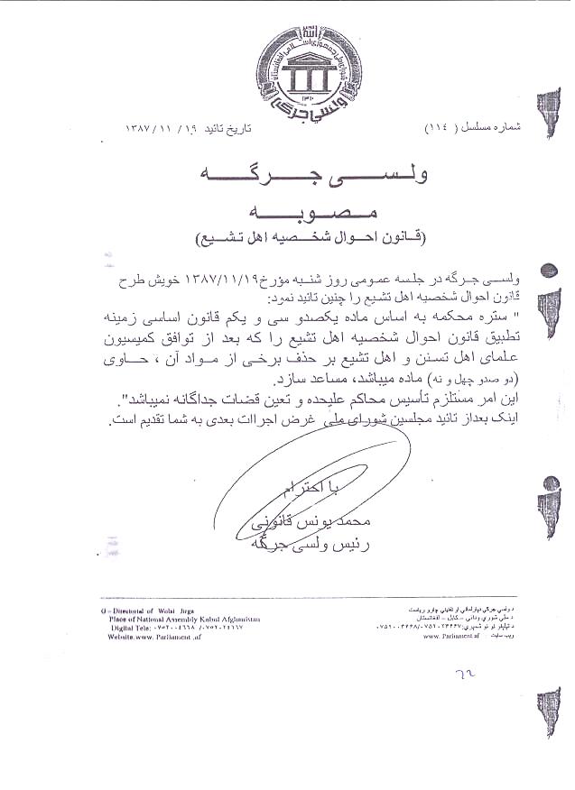آنچه در اينجا می آيد متنی به قلم شیخ آصف محسنی يکی از متهمان نقض حقوق بشر ، درباره ی قانونی ست که بتازگی درباره ی شیعیان افغانستان توسط پارلمان و رييس جمهور به تصويب رسیده و بدون کم و کاست برای روشن شدن افکار عمومی در کابل پرس به نشر می رسد. بديهی ست که اين قانون و نظرات شیخ آصف محسنی تنها نظرات متحجرترين بخش جامعه ی شیعه در افغانستان می باشد و با روحیه ی جمعی شیعیان و بويژه هزاره ها در تضاد کامل می باشد.