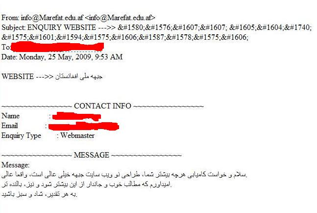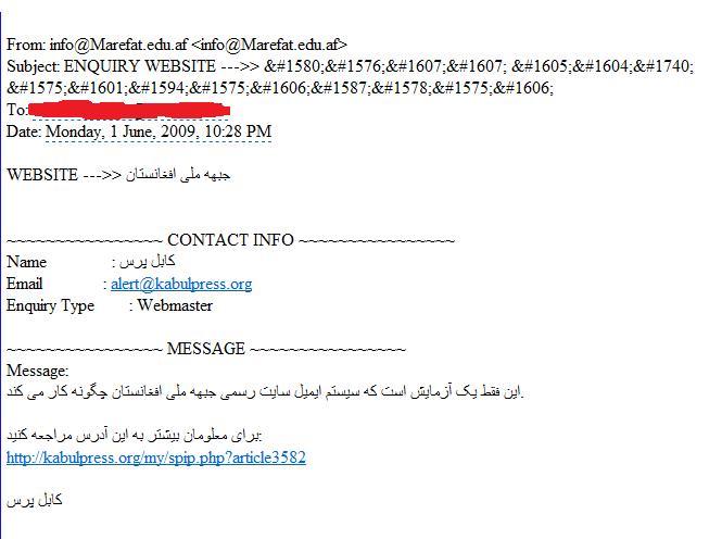 Providing image proofs, Najibullah says all the design of National Front’s website is a carbon copy of their school’s website. The designer copying the design without copyright permissions, have forgotten to change the Contact Us section of Marefat’s website, therefore all emails and letters to National Front, including the confidential ones, have been coming to the address of Marefat High School’s website.
