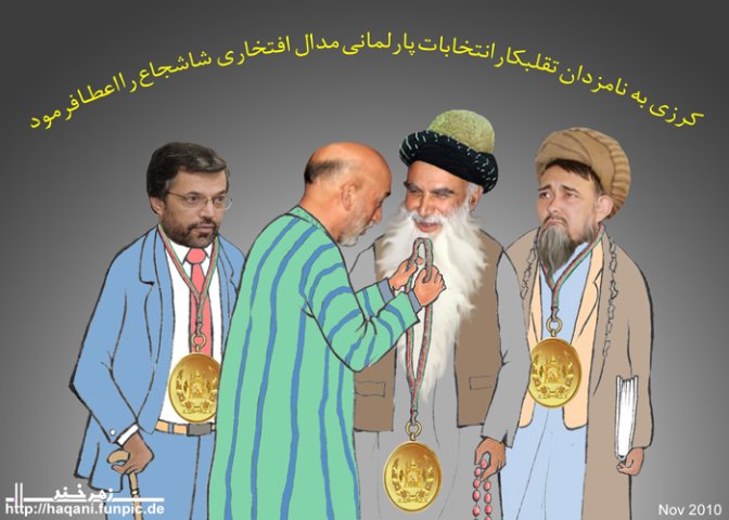 صفحه نخست > کارتون > طنز روز > کـرزی به نامزدان تقلـبکار انتخابات پارلمانی مدال افتخاری شاه شجاع را اعطا فرمود