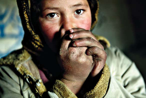 درجه دمای هوا در اینجا حالا، به 22 درجه سانتي گراد زير صفر مي رسد. زندگي در اینجا بسيار مشكل است، اما براي مردم اينجا، خاك آنها و گذشتگان آنان به حساب مي آيد. فاطمه دختر 12 ساله هزاره، دستهاي كوچك خود را با نفس خود گرم مي كند و كبري و دختر6 ساله اش حميده، در دهانه غار مشغول آماده كردن چاي هستند. در زير، تصوير خانواده اي را مي بينيد كه در خانه نشسته و فاطمه در حال خشك كردن كود حيوانات مي باشد كه بعدأ از آن براي روشن نگه داشتن آتش استفاده خواهند كرد.