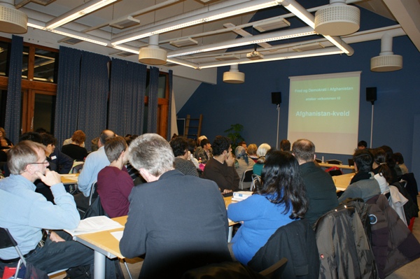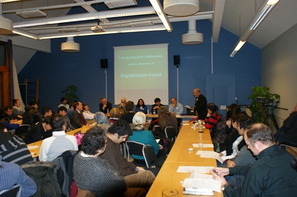 روز پنجشنبه تاریخ 03.12.09 " صلح و دموکراسی در افغانستان" جلسۀ در اوسلو پایتخت کشور نروژ با عنوان "شب افغانستان: یادو بودی از قربانیان، استراتژیی برای بازماندگان" برگزار کرده بود که در آن از نهادهای فرهنگی، سازمانهای ضد جنگ و مدافعین حقوق بشر و همچنین افراد روشن فکر و تحلیلگران سیاسی افغانی و نروژی اشتراک داشتند. این برنامه به بخشهای ذیل تقسیم بندی شده بود.