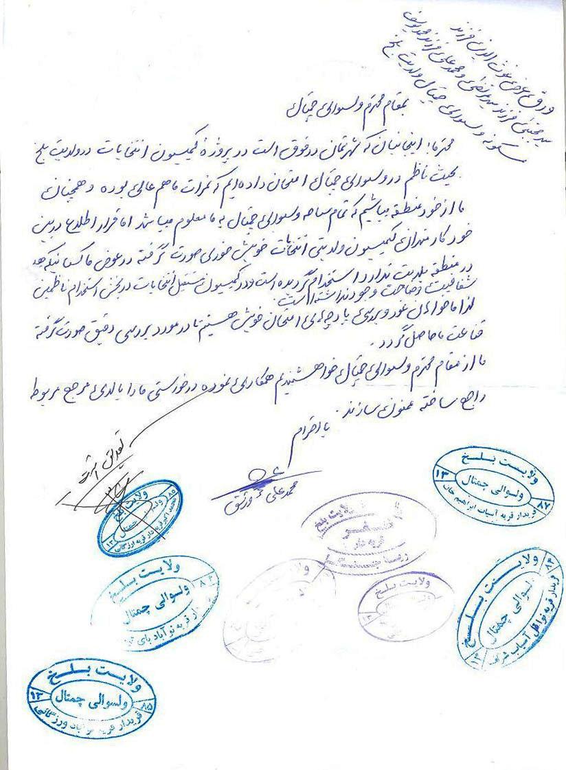 مافیای انتخابات در شمال نه بلکه در ولایت بلخ در محمد و همکارانش هر یک آصف قلندر مسول آگاهی عامه، تپش جان، فواد، فضل خان شرابی، اجمل حان وغیره میباشد. من یک غریب و بکار ضرورت داشتم آنوقت بنام ریس زون اصلاَ کسی را از مرکز معرفی نکرده بودند اعلان پست برای مبلیغین آگاهی عامه اعلان شده بود و من نزد قلندر مسول آگاهی عامه ولایتی بلخ رفتم و گفتم بمن کمک نماید برایم گفت برایت کمک میکنم اما برایم 400 دالر بده گفتم میدهم اما از معاشم فعلاَ ندارم از دستم گرفت و به موتر خود شاند که آن موترش هم بشکل کرایی در دفتر بلخ کار میکرد و گفت درست است خیر تو برایم خط نوشته کرده بتی که از من قرضدار هستی و برایش چنین کار را کردم که حاضرم روبرو برایش اظهار نمایم. چه فکر میکنید آیا اینها بدون دست داشتن با آمر دفتر ولایتی بلخ امکان دارد؟