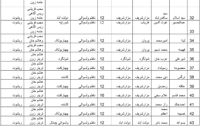 دراین جدول شمه ازخیانت ، خویش خواری ، ریشوت ،وکارهای غیراخلاقی محترم داکترولی الله امیر همرای تیمش هریک محترم محمد هاشم خان ریس آموزش زون شمال ومحب الله قریشی ریس اگاهی عامه زون شمال و... به نمایش گذاشته شده است گروپ مذکور با سوی استفاده ازصلاحیت های وظیفه وی اقارب وخویشوندان خود ، افراد بد نام وحتی متعلمین مکتب را درمقابل ریشوت وغیره مسائیل استخدام کردند که بعضی شان سن رای دهی که 18 میباشد تکمیل نکرده اند ودیگر اینکه نظربه پروسیجر کاری کارمندان باید ازخودولسوالی تعین میشد اما متاسفانه خود شما درجدول مشاهده مینماید که بعضی اشخاص ازولایات دیگر درمقابل ریشوت وغیره مسائیل دربعضی ولسوالی ها وظیفه داده میشود که خود آن ولسوالی اشخاص تحصیل کرده وبا تجربه دارد ومردم ولسوالی ها چندین مرتبه درمراجع مختلف شکایت میکند اما کسی پیگیری نمیکند ، به امید روز که حق به حق دار برسد