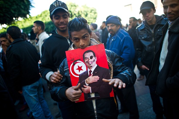 در تونس مردم دست به انقلاب زدند و جل و پلاس دیکتاتور را جمع کردند. درخواست بازداشت دیکتاتور به پلیس اینترپل ارسال شده است.