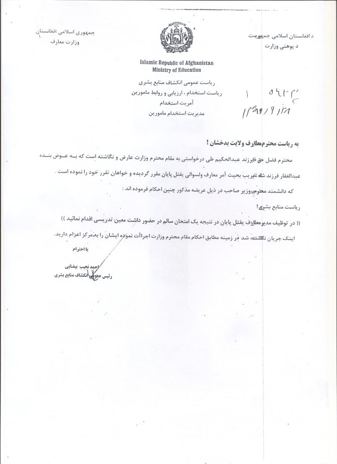 وزارت معارف ایشان را خلاف اصول، قوانین، لوایح، و مقررات معارف به تاریخ 11/07/1389 توسط ریاست معارف بدخشان مجدداً به عنوان مدیر معارف یفتل پایان، معرفی نمودند. بناً بنده ورقه ی عرض را ضمیمه ای کاپی اسناد های فوق به وزارت معارف تقدیم نمودم که وزیر معارف در حشو آن چنین حکم را صادر نمودند: ریاست منابع بشری در توظیف مدیر معارف یفتل پایان در نتیجه یک امتحان سالم در حضور داشت معین تدریسی اقدام نمایید. 22 قوس 1389 فاروق وردک وزیر معارف