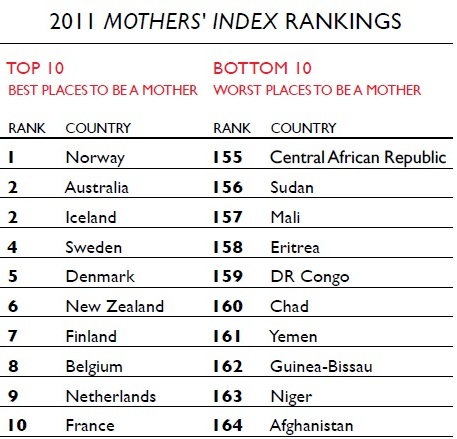 نهاد دفاع از حقوق کودکان بنام "سیو چیلدرن" در گزارش خود از افغانستان به عنوان بدترین کشور برای مادران نام برده و پس از افغانستان کشورهای نیجر، گینه بیسائو، یمن، چاد، کنگو، اریتریا، مالی و سودان قرار دارند. در مقابل کشورهای نروژ، استرالیا، ایسلند، سویدن، دانمارک، نیوزلند، فنلاند، بلژيک، هلند و فرانسه به ترتیب بهترین کشورها برای مادران می باشند. در حالی که در کشورهایی همچون نروژ، مادران بیش از 80 سال عمر می کنند، در افغانستان و سایر کشورهای قعر جدول، عمر مادران از 45 سال تجاوز نمی کند.
