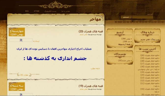 وبلاگ "مهاجر" نیز با نشر مطالب، وضعیت بد مهاجرین افغان را در ایران به اطلاع جهان می رساند که امروز از سوی مسوولین حکومتی ایران فلتر شد.