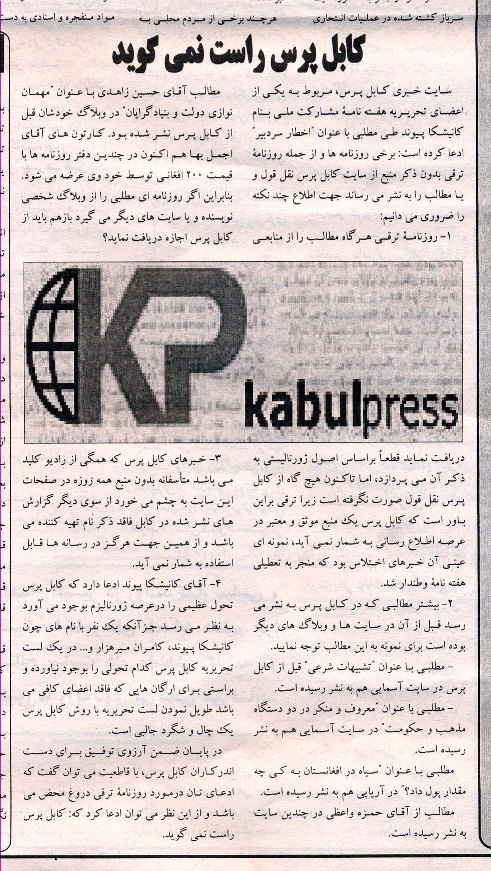 Top Global Newspapers: Asia Latin America Africa Europe USA Canada Australiaفقط با ذکر ماخذ، نام نويسنده و تاريخ انتشار می توانيد از مطالب ، عکس ها و آثار ديگر در کابل پرس استفاده کنيد Members Login As the mind has no boundaries, the RAHA concept does not have frontiers and is opposed to information and cultural control by global communication entities whether media conglomerates, states or local governments, or religions Kamran Mir Hazar: Editor-in-Chief / Afghanistan/ Kabul/ Mobile: 0093 799390025/ Email: editor at kabulpress.org info at kabulpress.org reader at kabulpress.org Copyright© Kabul Press, World Media Home 2004 -2006 کليه ی حقوق بر اساس قوانين کپی رايت محفوظ و متعلق به سايت کابل پرس می باشد | |||||||||||||||||||||