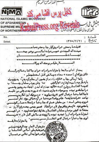 کابل پرس افشا می کند! ارتباط صبغت الله مجددی با طالبان در سال 1375 ميانجی گری مجددی ميان طالبان و جنرال دوستم کابل پرس: سند اول که در برگ رسمی جبهه ملی نجات افغانستان و با دست خط و امضای جناب صبغت الله مجددی می باشد از رابطه ی وی با گروه طالبان که او در اين سند تحريک طالبان آن را می نامد و ميانجی گيری ميان اين گروه با جنرال دوستم پرده بر می دارد. ظاهرا آقای مجددی با بنيادگرايی در افغانستان تعهداتی دارند و تاکنون که رييس کميسيون تحکيم صلح و رييس سنا می باشند، اين ارتباط را حفظ کرده اند. آقای مجددی در قالب کميسيون تحکيم صلح صد ها، طالب را به امتيازات رسانده اند. اين در حالی است که قربانيان جنگ در افغانستان، نان خوردن را ندارند و حقوق بشر همچنان نقض می شود. سند دوم پاسخ جنرال دوستم می باشد که بر اين ميانجی گری تاکيد می کند. اميدواريم انتشار اين اسناد علاوه بر آگاهی همگانی، دستاويزی برای کسانی باشد که در راه حقوق بشر فعاليت می کنند و همچنين کسانی که تاريخ معاصر افغانستان را می نگارند. سند سوم نيز رابطه ی دوستم با جبهه ی بنيادگرای نجات به رهبری مجددی را می رساند که گويا در حوالی همين تاريخ و در پی توافق، هرات بمباران شد.