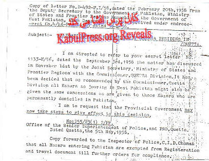 کابل پرس افشا می کند! سند اقدام پاکستان عليه اتباع افغانستان نامه ی شماره D-492-F.I/58 از آرشيف محرمانه پاکستان کابل پرس: اين سند در تاريخ20 فبروری سال 1958 از طرف وزارت داخله پاکستان به حکومت غرب پاکستان نوشته شده و در آن بر شکنجه و آزار و اذيت اتباع افغانستان تاکيد شده است. در اين سند، نامه و پاسخ آن می باشد. اصل سند، نزد منبع کابل پرس که نخواست نامش فاش شود، موجود می باشد. افشای اين سند می تواند مداخلات دوامدار پاکستان در افغانستان را نشان دهد. همچنين اين سند با توجه به سند فاش شده از ملا عمر درباره کوچ اجباری، نشان دهنده ی سياست پاکستانی طالبان می باشد. خوانندگان عزيز می توانند با دنبال کردن سند مربوط به حکومت پاکستان، فرمان 11 ماده ای ملا عمر، سند ارتباط صبغت الله مجددی با طالبان و ميانجيگری وی ميان جنرال دوستم و طالبان، به ارتباطات پنهان تاحدودی پی ببرند.